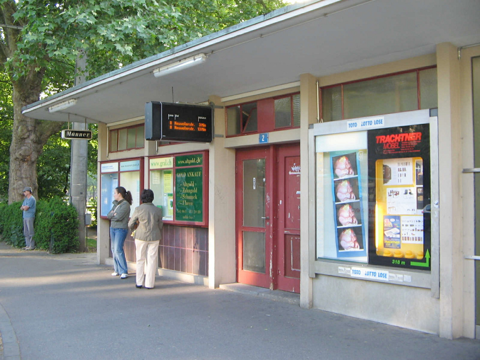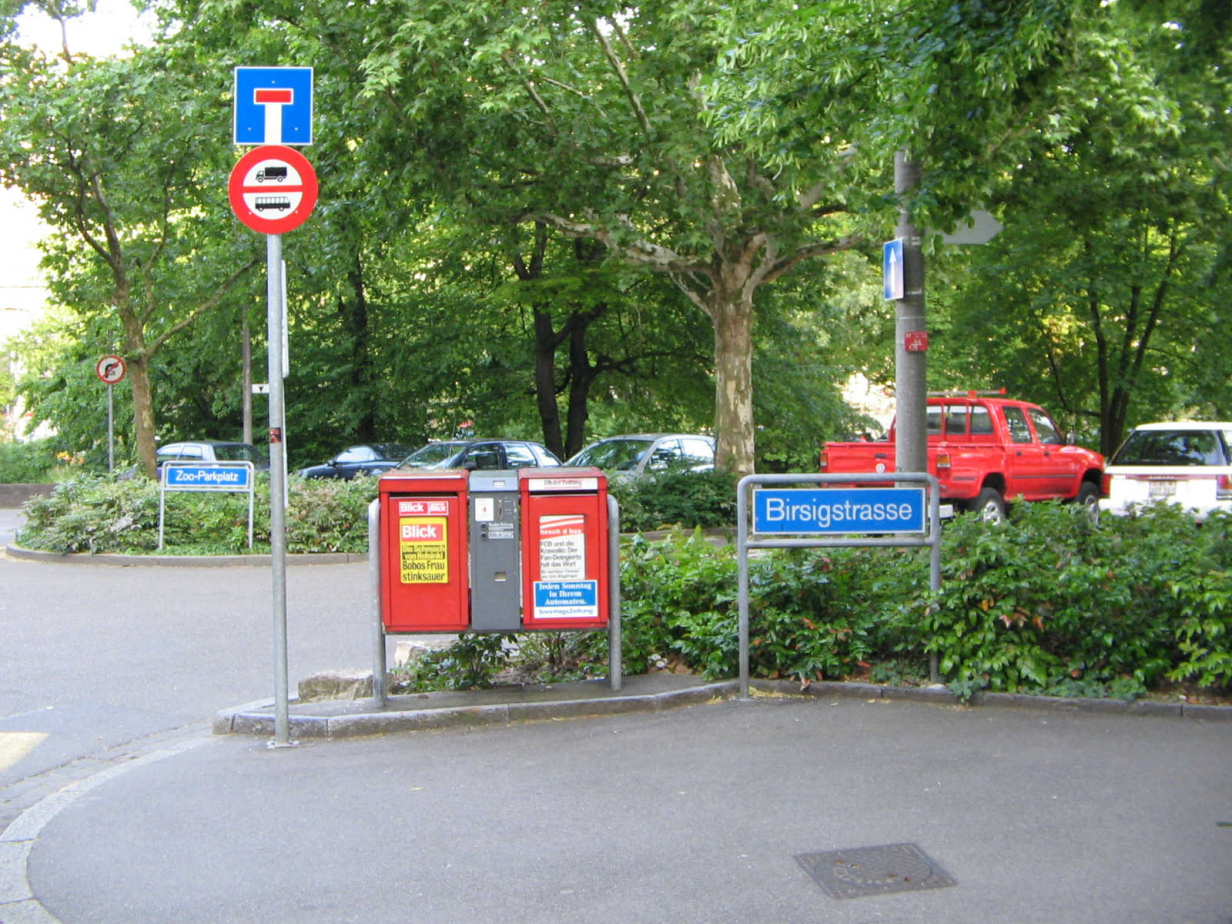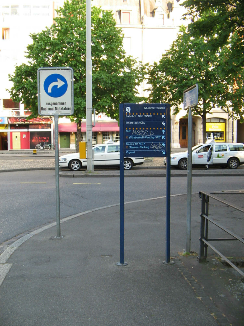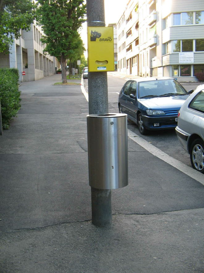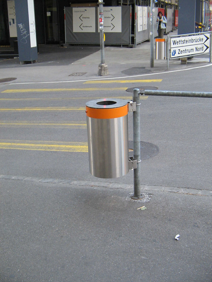 Die metallenen Abfallkübel mit kleinem, rundem Loch waren zuerst in Zürich. Jetzt sind sie in Basel, mit einem kleinen Baslerstab drauf. Zürich hat auf Abfallkübel mit Sockel umgestellt. In Basel laufen die Sehbehinderten bis heute in die Abfallkübel hinein, weil die Kübel keine Sockel haben...