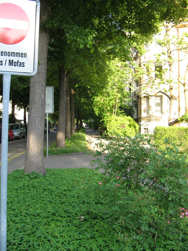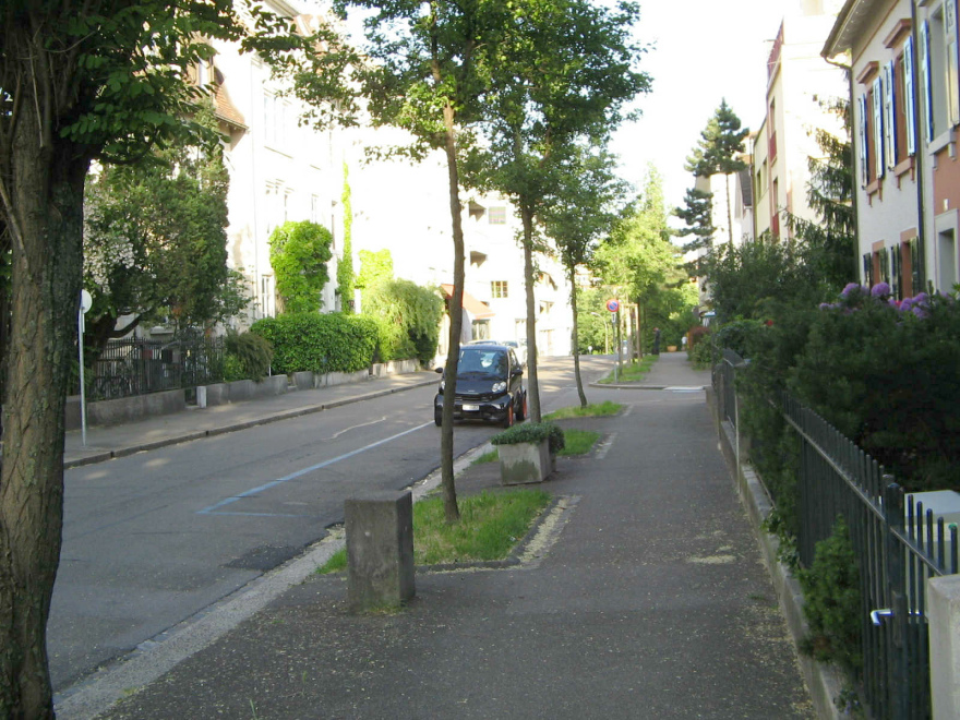 ... als Ausgangspunkt eines regelrechten "Baumtunnels". Bäume sind in Basel sehr gut gepflegt. Die Stadtverwaltung hat die Pflege zum Teil sogar Privatpersonen überlassen, um den Wert des Baums in der Bevölkerung mehr zu verankern.
