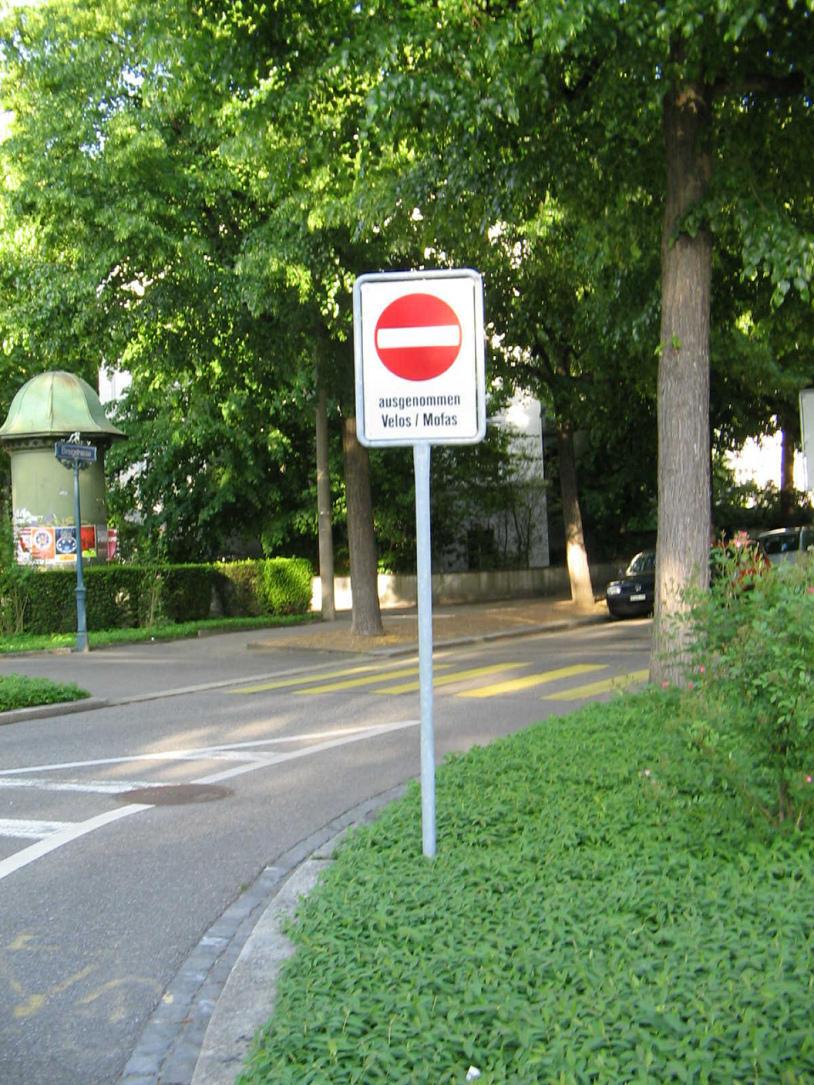 Basel ist eine zum Teil sehr velofreundlich organisierte Stadt, vor allem mittels der Velodurchlässigkeit von Einbahnstrassen, die mit diesem Verkehrszeichen signalisiert wird. Man könnte auch Signete setzen, um das Verständnis zu erleichtern.