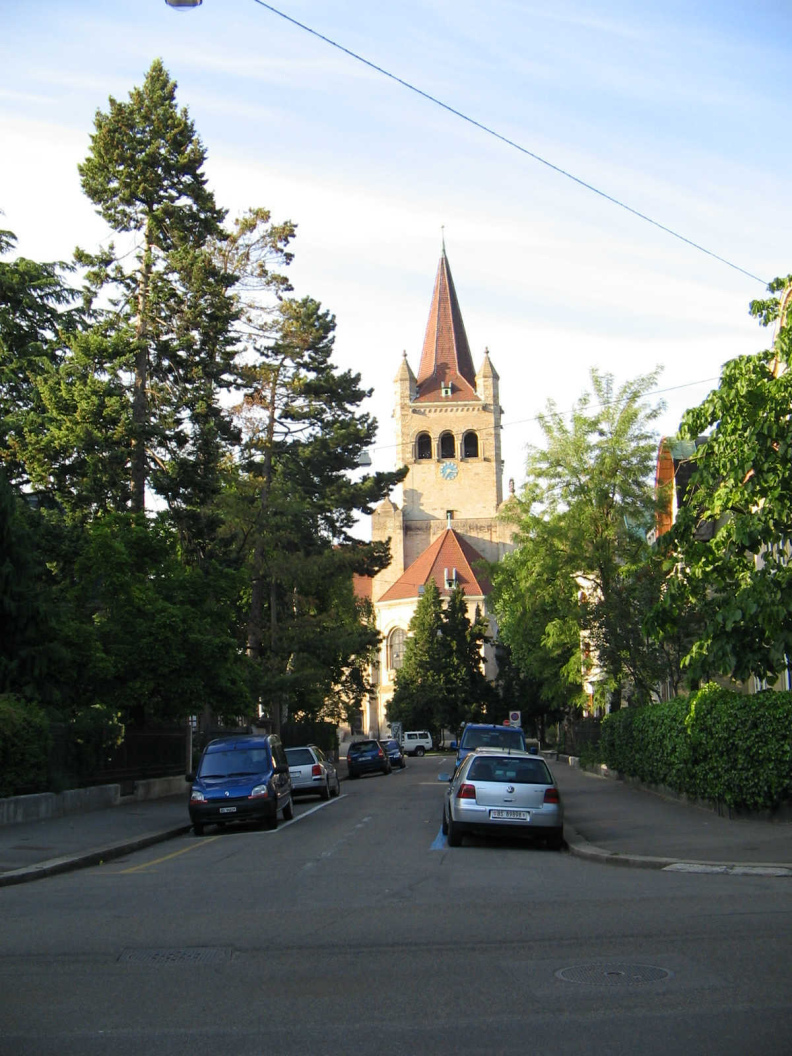Die 1901 erbaute Kirche [1] mit einem mächtigen, viereckigen, zentralen Spitzturm und mit den romanisch anmutenden Arkaden und Fenstern erscheint sehr eigenwillig, und die kleinen Türmchen in den Ecken erinnern wiederum an Festungsbauten. Wer in der Nähe der Pauluskirche wohnt, wird vom Glockengeläut beschallt, so wie das in der Schweiz bis heute alle 15 Minuten üblich ist. Leute, die kein Glockengeläut ertragen, müssen sich die Wohnung in der Schweiz also dort suchen, wo keine Kirchen sind, und das ist manchmal gar nicht so einfach...