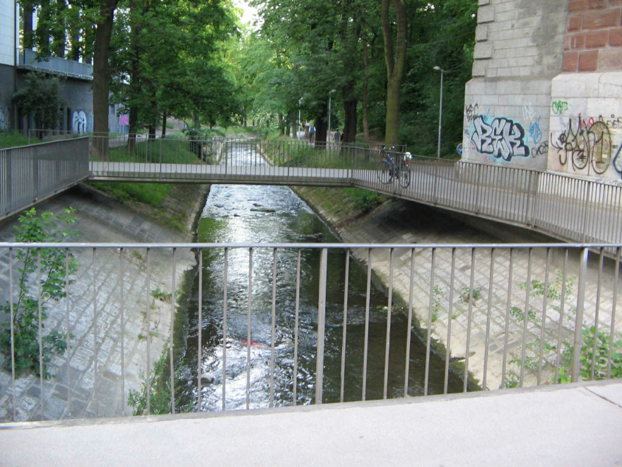 Basel, der Bach Birsig mit Fussgängerbrücken unter der Viaduktstrasse