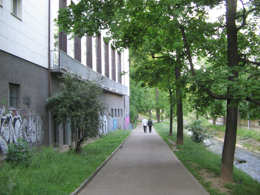 Der linke Fussweg "Nachtigallenwäldeli" am Birsig, links das Hallenbad "Rialto"