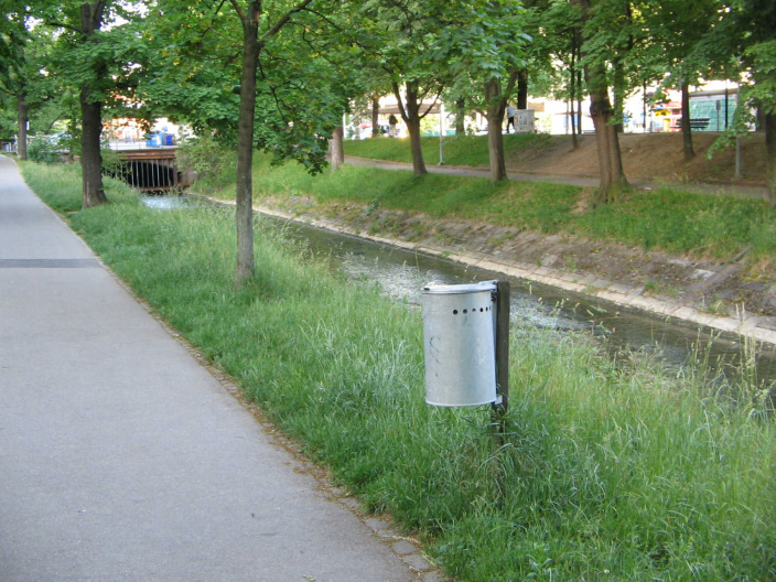 Abfallkübel mit Deckel am Birsig, Nahaufnahme