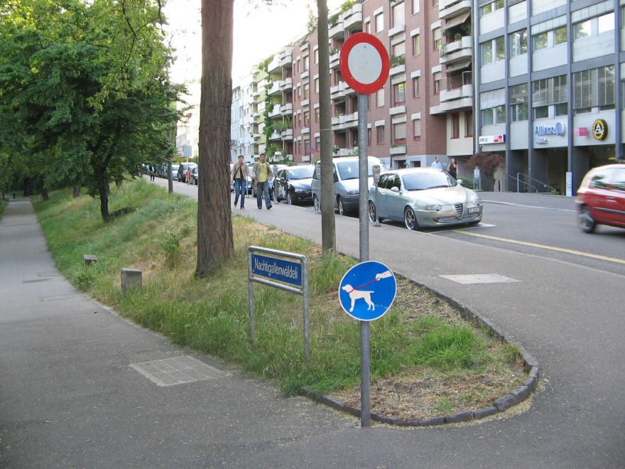 Das Wegschild "Nachtigallenwäldeli" mit dem Verkehrszeichen "Leinenzwang für Hunde"