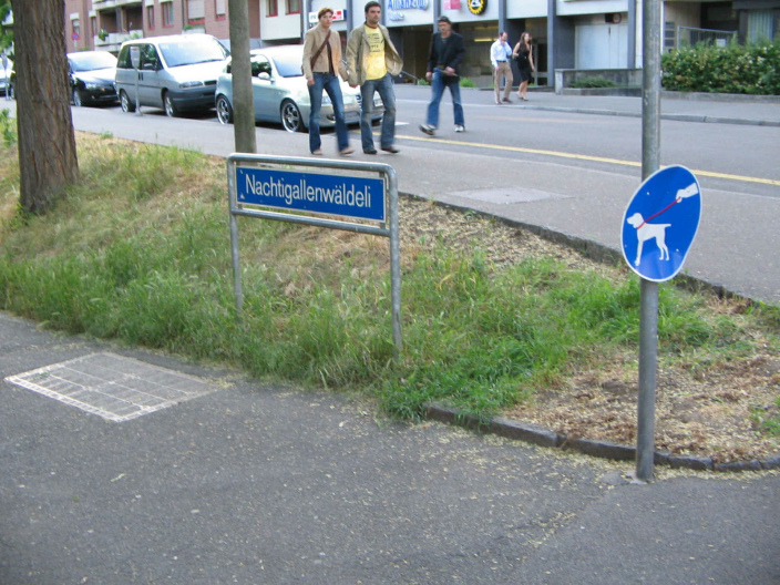 Das Wegschild "Nachtigallenwäldeli", Nahaufnahme