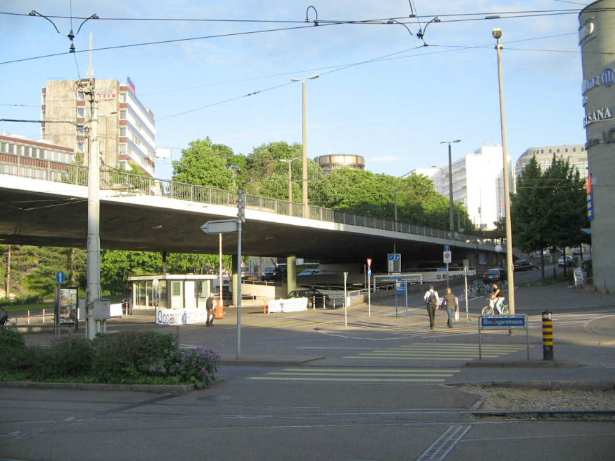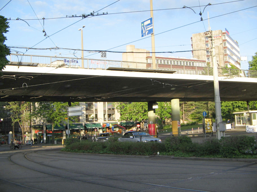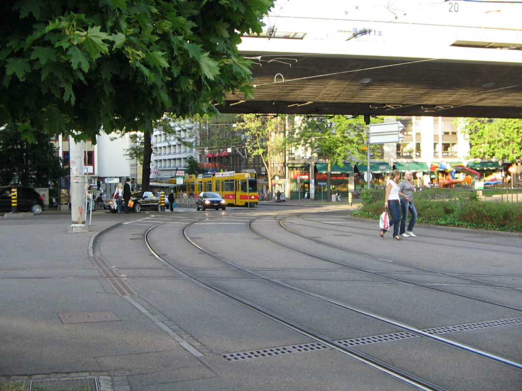 Die Birsigstrasse führt unter der Viaduktstrasse hindurch ("Birsigviadukt")