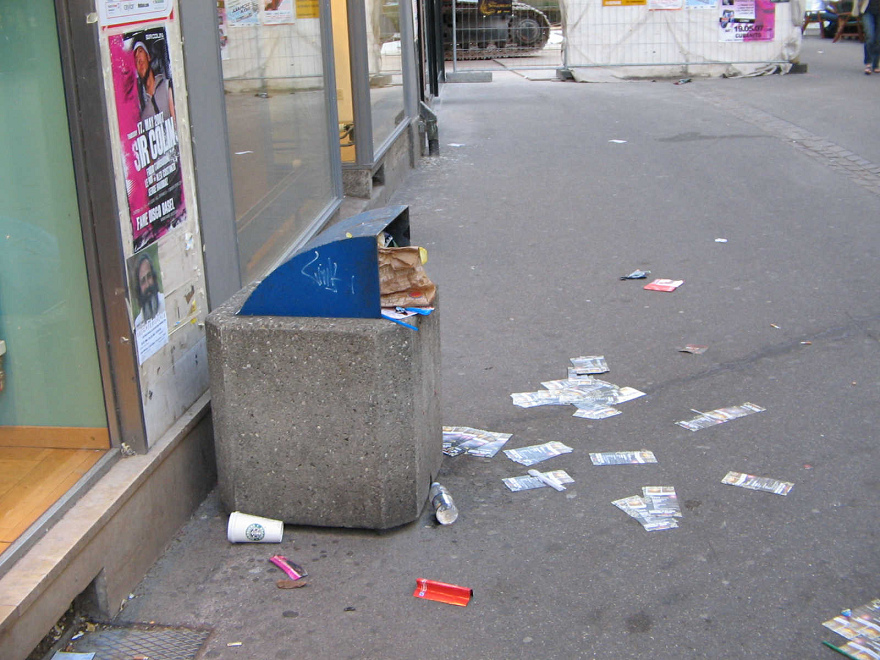 Seit es in Basel drei McDonalds und Burger King und Cindy und all den substanzlosen und gesundheitsschädlichen Fastfood-Scheiss gibt (hohe Belastung von Leber und Nieren durch Fette, einseitige Ernährung mit Weizenbrötchen, minderwertiges Fleisch etc.), sind die Abfallkübel nicht mehr gross genug. Aber die englisch-"amerikanische" Regierung von Basel will das eben so, denn je mehr Kranke es gibt, desto mehr Giftpillen der Giftchemie werden verkauft, und desto mehr steigen die Aktienkurse der "heimischen Industrie"...