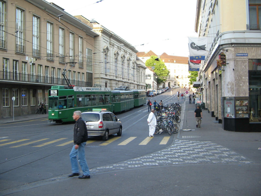 Hinter dem dreiteiligen Tram Nr. 14 sind die Bauten der Casinosäle zu sehen. Der Musiksaal ist der weisse Bau im hinteren Teil. In den ersten Jahren des neuen Jahrtausends wurde sogar das Problem der Erschütterungen durch die Tramgeleise gelöst (wenn die Trams die Weisen befahren), indem die Geleise und Weichen auf der Länge des gesamten Steinenbergs auf "Stossdämpfer" gesetzt wurden. Ja, was die Musik nicht alles kostet...