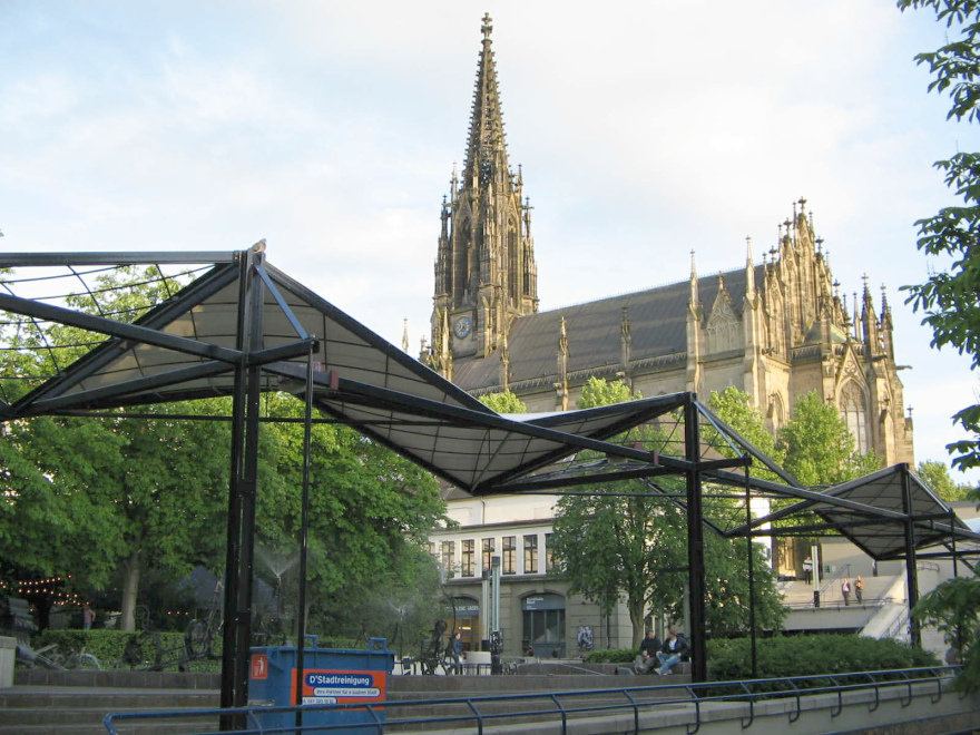 Die neugotische Elisabethenkirche (Bauzeit 1857 bis 1865 [9]) ist derart imposant, dass sie von Touristen oft mit dem Münster verwechselt wird. Die Elisabethenkirche ist aber - durch den Bau der Lukaskirche 1973 und durch die Verstümmelung bzw. Abriss von Anbauten und Blockade von Durchgängen durch den Neubau des Theaters ab 1975 [9] - nicht mehr nur Kirche, sondern dient seit 1994 auch als Kaffee und Konzertraum.