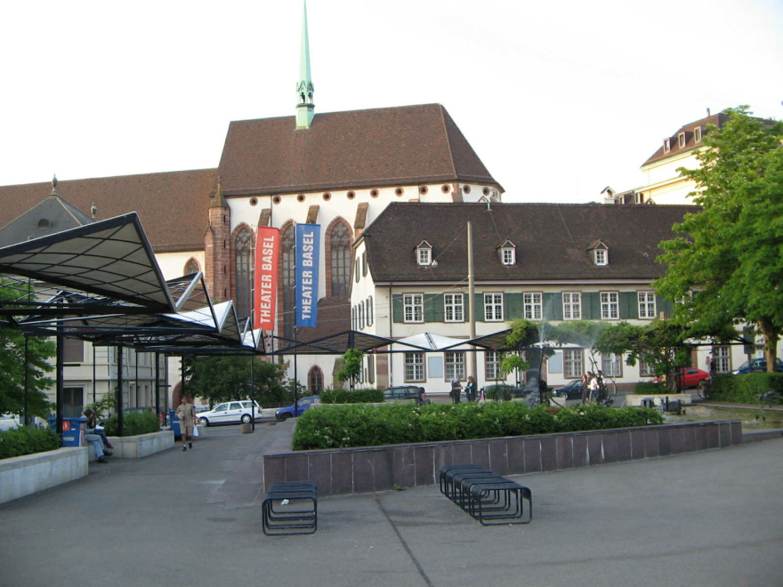 Basel, die Theatertreppe, im Hintergrund die Elisabethenkirche