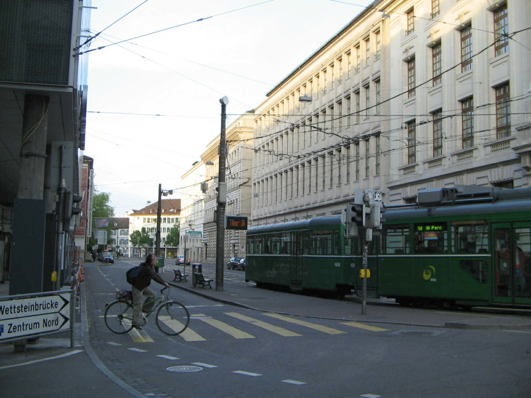Man spaziert nun für einen Moment durch den absolut ungemütlichen Sankt-Alban-Graben, eine Hauptdurchgangsstrasse von Basel zwischen Hauptbahnhof und Wettsteinbrücke. Auf dem Foto ist ein Tram der Linie 14 zu sehen, das sich bereits auf der letzten Fahrt ins Tramdepot befindet, das Tramdepot beim "M-Parc" beim Dreispitz-Areal.