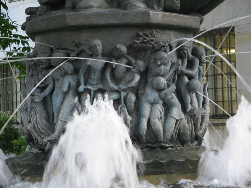 Der Brunnen ist ein Beispiel, wie man für die Menschen an einem grossen Brunnen mit Statue in der Mitte einen Trinkwasserzugang am Rand schaffen kann. An den kleinen Wasserspeiern kann man die Wasserflasche füllen.