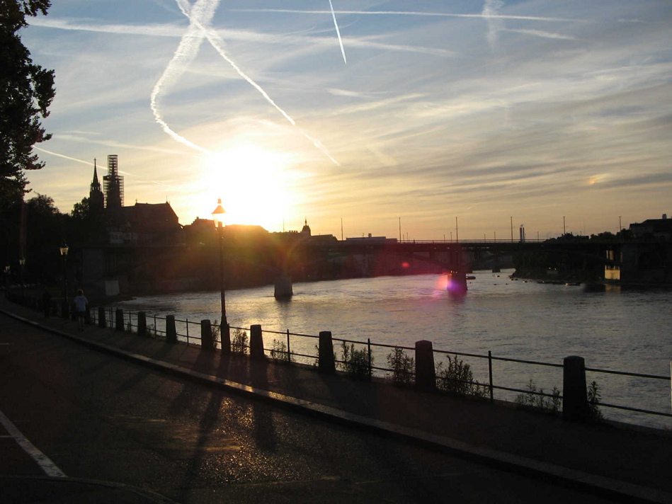 mit Zschokke-Brunnen - Sankt-Alban-Vorstadt - Sankt-Alban-Rheinweg mit Sonnenuntergang an der Rheinpromenade - Stadtmauer - Birsköpfli - Schleuse Birsfelden - Mittlere Brücke