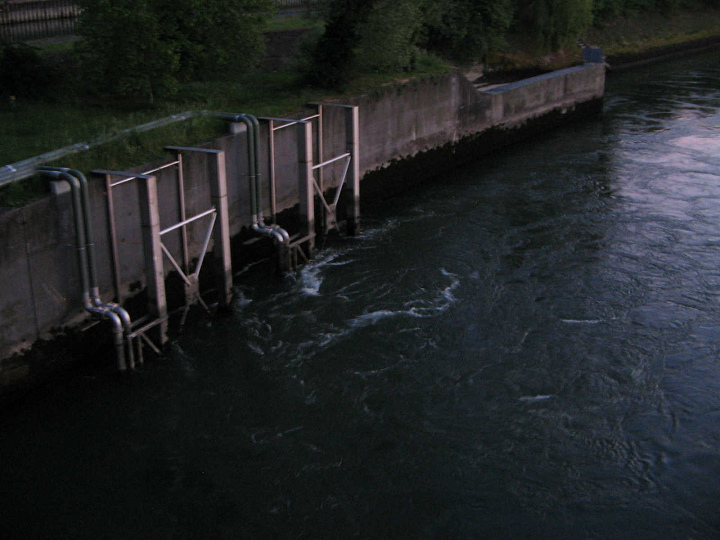 Birsfelden, Schleuse, Wassersprudel aus dem Turbinenhaus