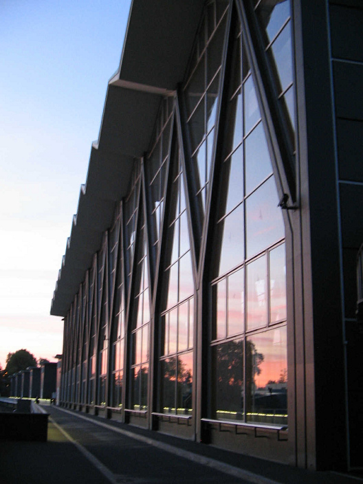 Die Glasfassade ist lebendig gestaltet und fasziniert hier durch die Spiegelung des Sonnenuntergangshimmels. Die toten Vögel, die sich an der Glasfassade des Maschinenhauses die Schnäbel brechen und elendiglich daran sterben, werden nicht gemeldet.