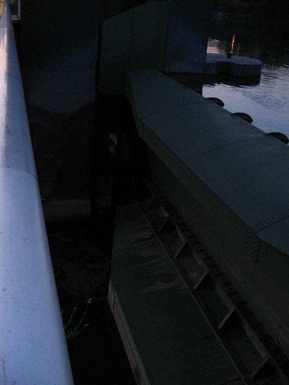 Hier sehen wir die Brücke über den unteren Zugang zu den Schleusentoren und eine Seite des Turbinenhauses.