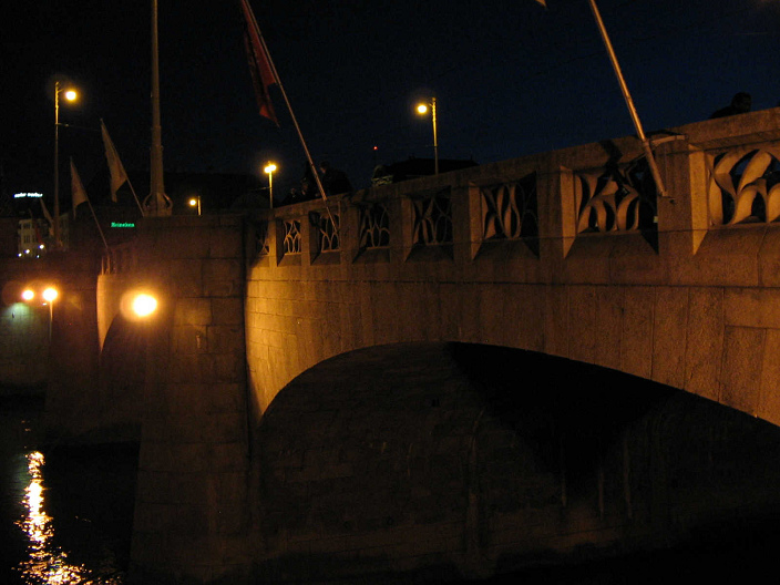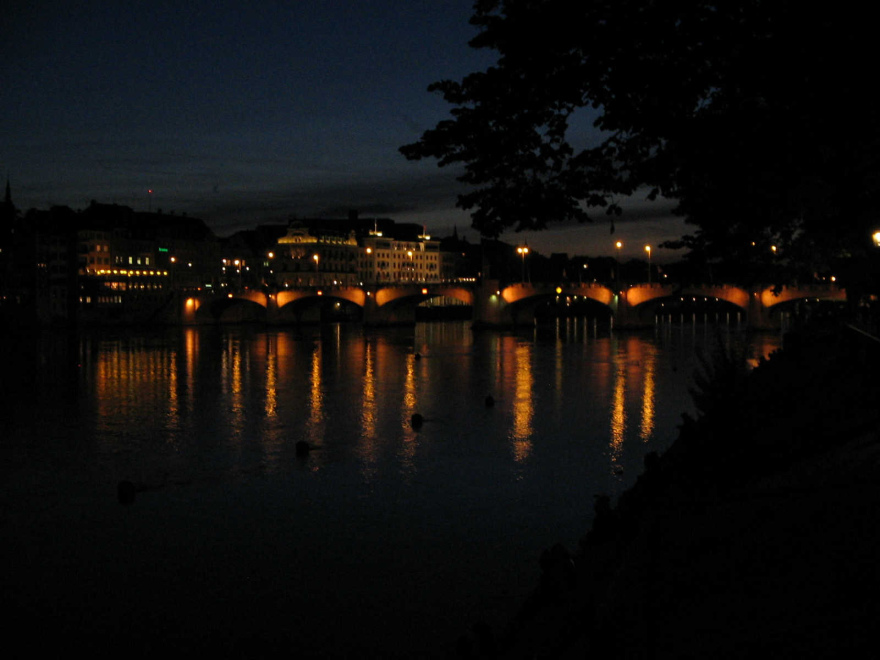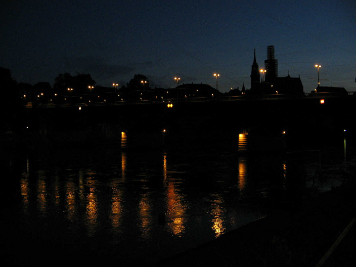 spiegelt sich der Himmel  Basel, Mittlere Brücke am späten Abend mit