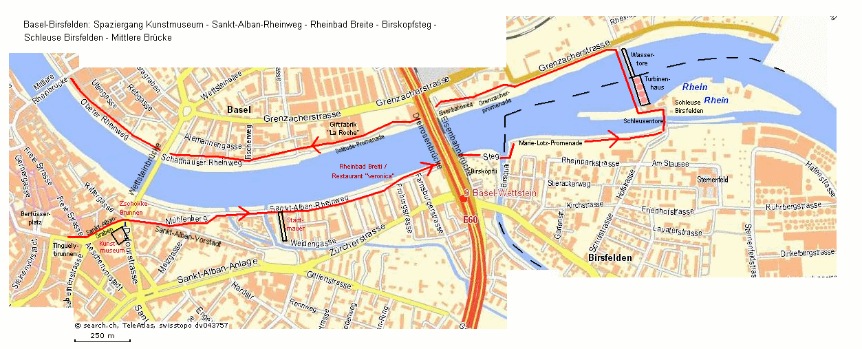 vergrössernKarte Spaziergang Sankt-Alban-Graben - Kunstmuseum - St.-Alban-Rheinweg - Rheinbad Breite - Birskopfsteg - Schleuse Birsfelden - Mittlere Brücke