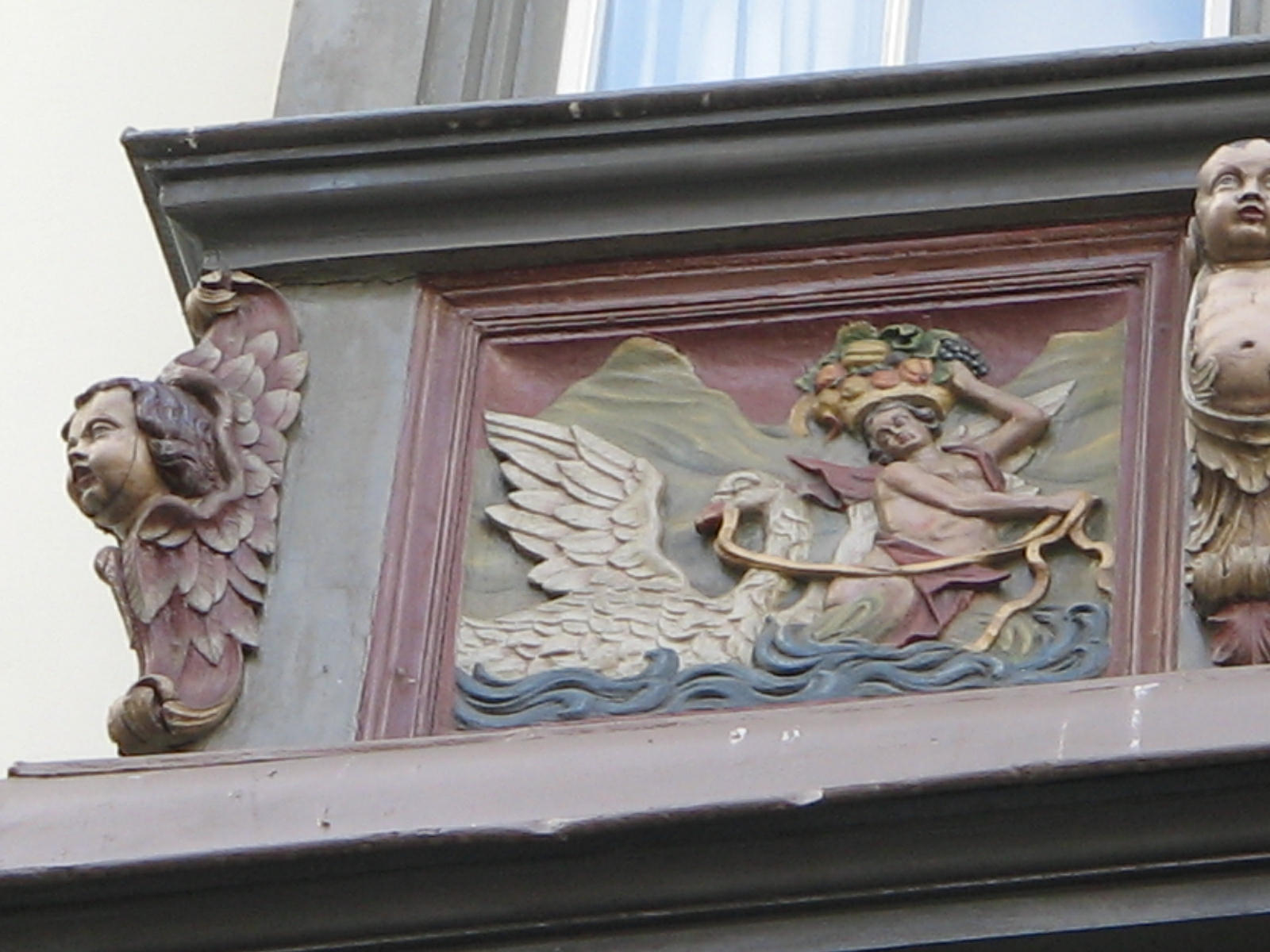 Relief 02 frontal links, Engel auf Schwan mit einem