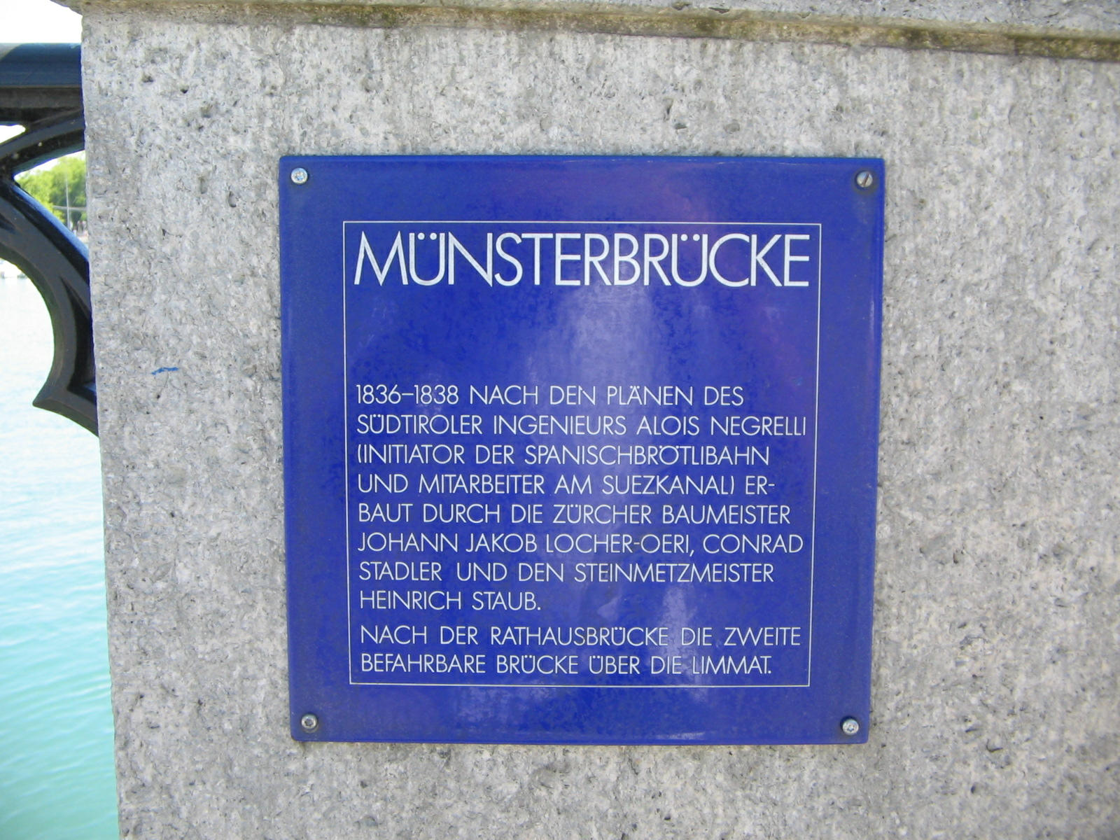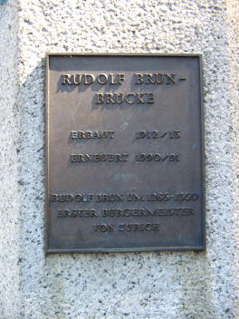 (orig.: "Rudolf Brun-Brücke, erbaut 1912/13, erneuert 1990/91. Rudolf Brun um 1285-1360, erster Burgermeister von Zürich.")