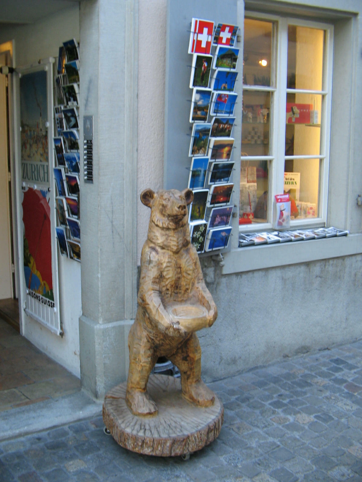 Zurich, Schipfe, shop "swisssouvenir" with a statue of a bear carved in wood holding a plate