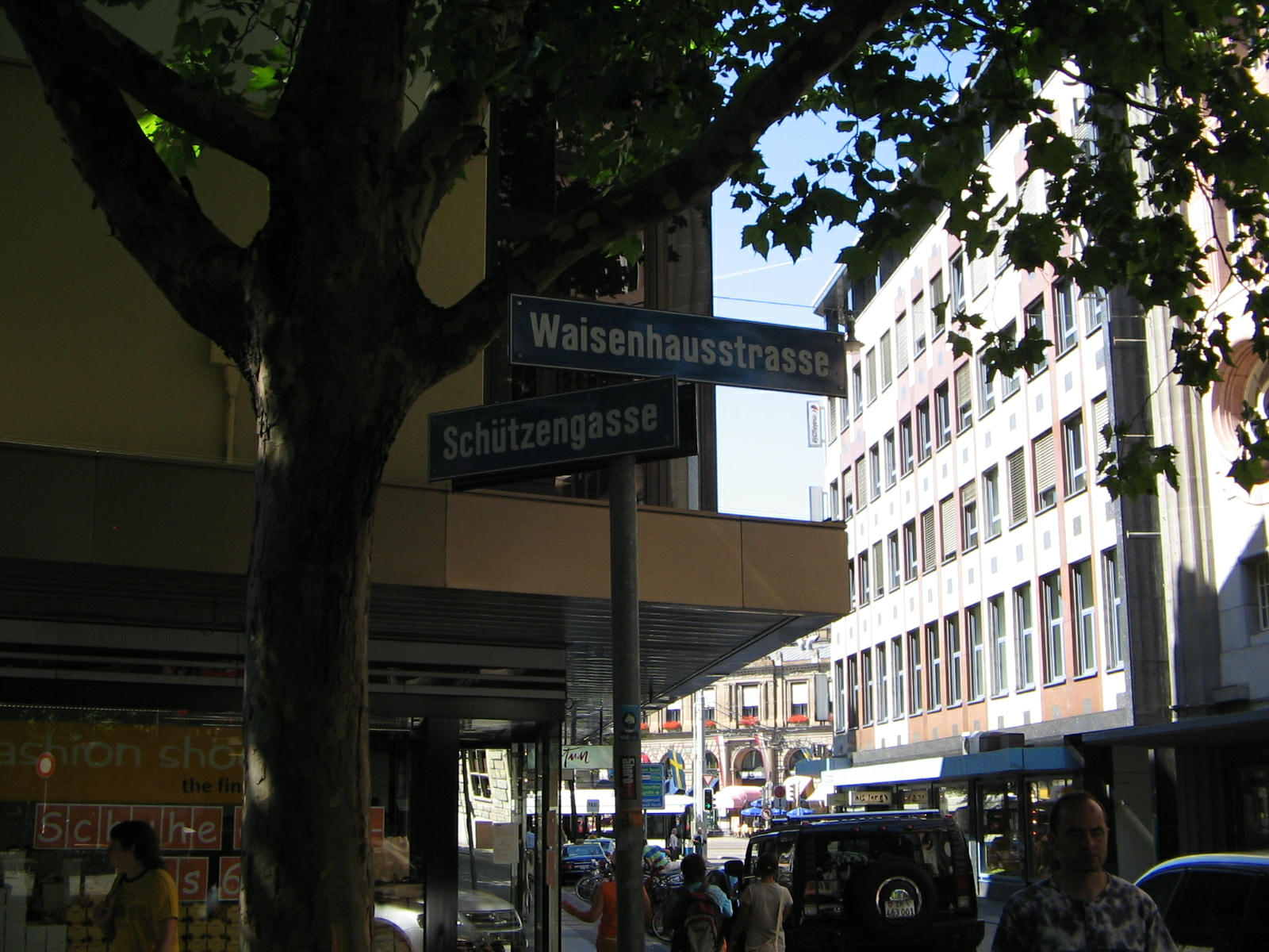 Road signs at the crossing Waisenhausstrasse / Schützengasse (Orphanage Street / Shooter Alley)