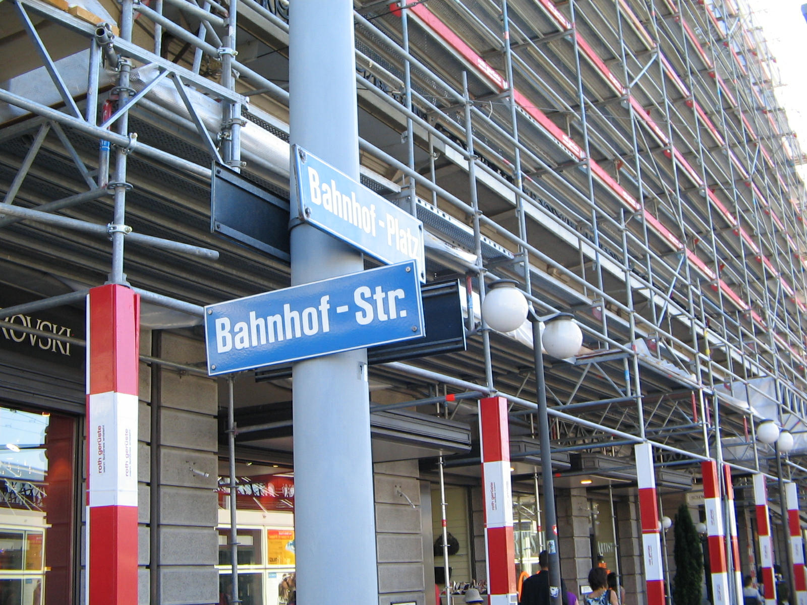 Road signs at the corner of Bahnhofplatz / Bahnhofstrasse (Station Square / Station Street)
