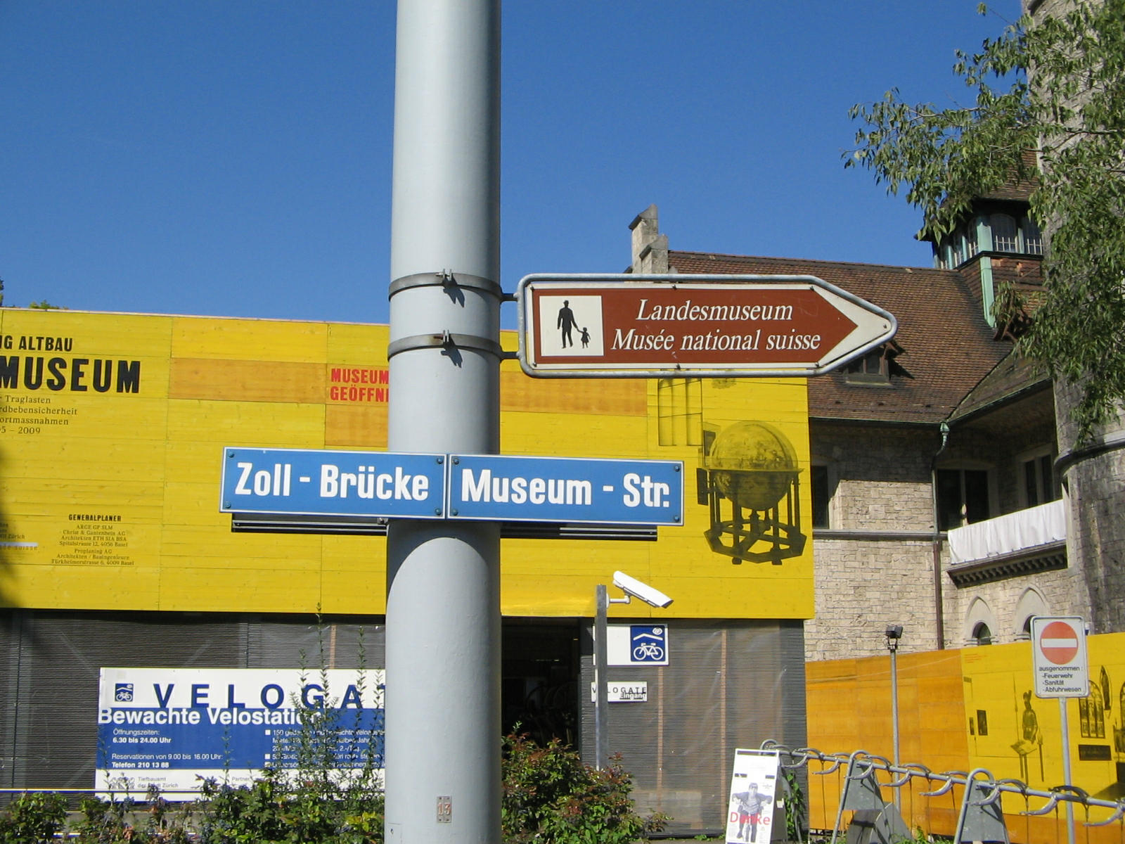 Road signs of Zollbrücke (Customs Bridge), Museum Street and a signpost to the Landesmuseum (State Museum, French indication: Musée national suisse)