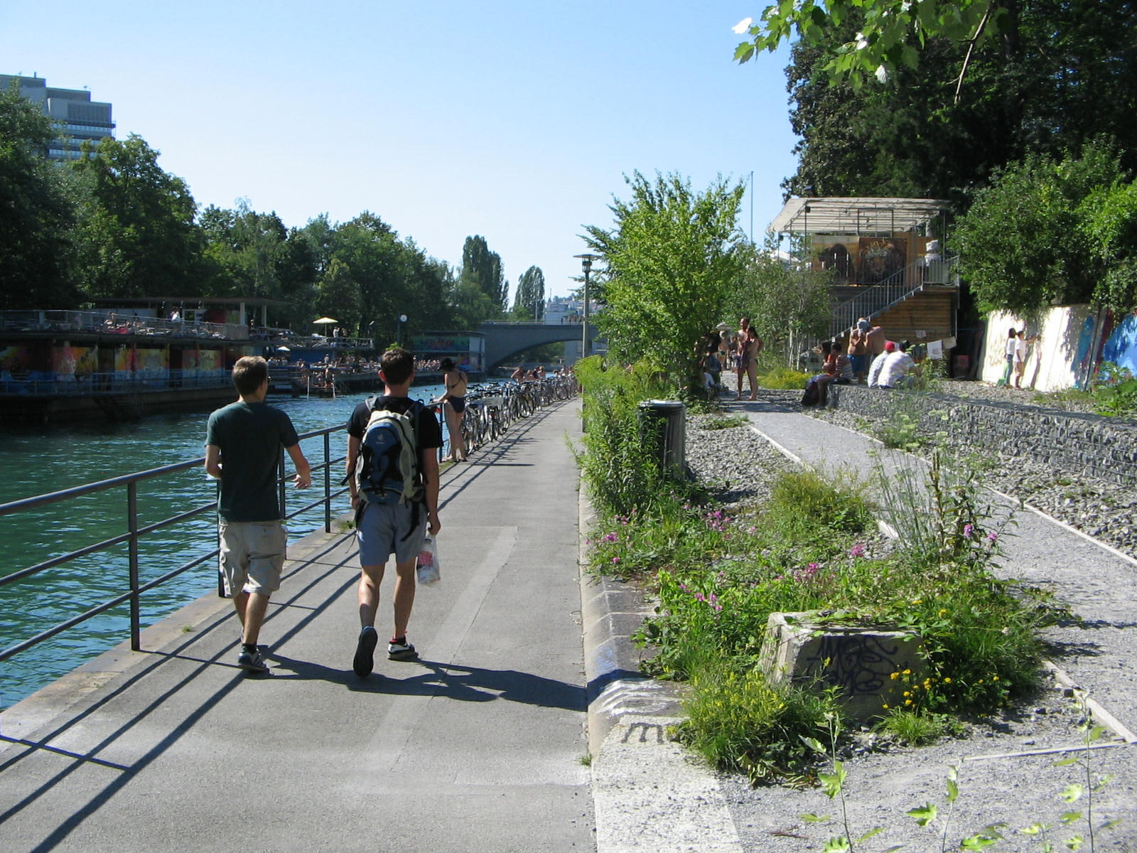 Zurich at Letten Viaduct, people walking at a Limmat river wall