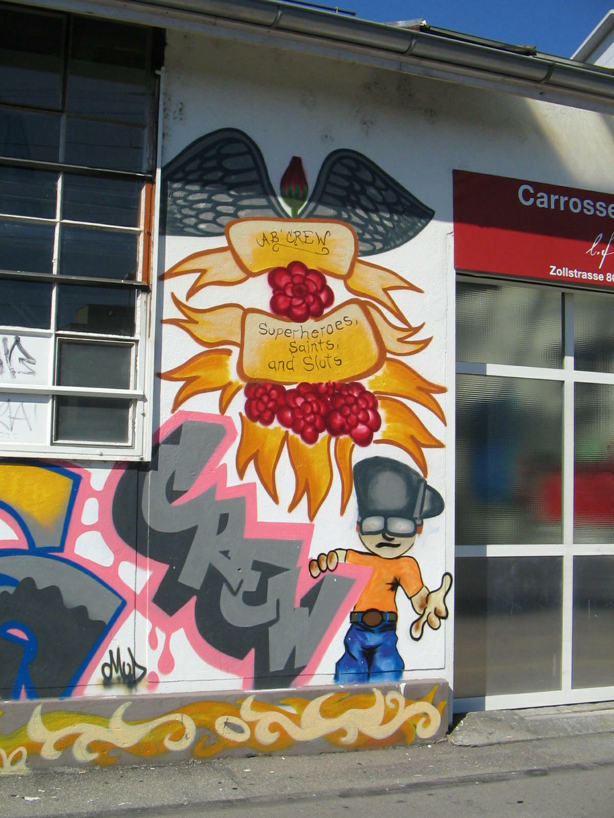 Zurich, Zollstrasse (Customs Street), graffiti "Super heroes, Saints and Sluts"