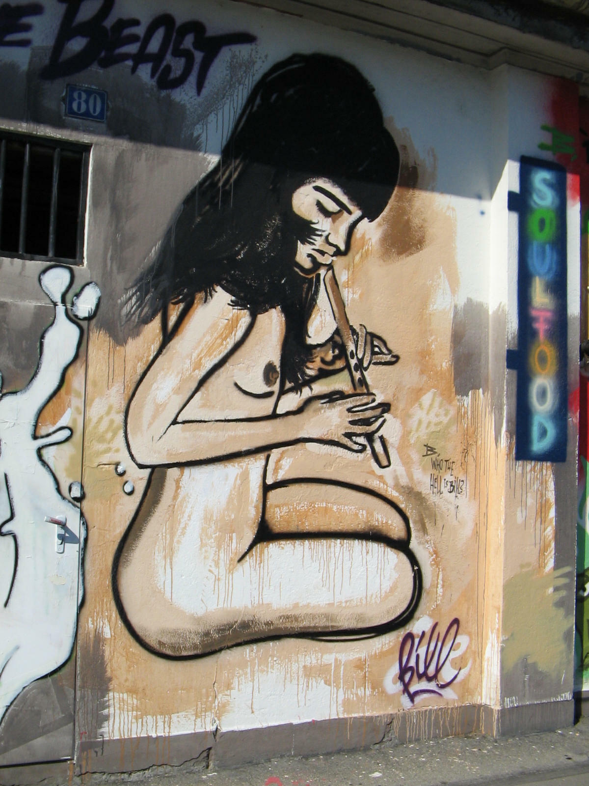 Zurich, Zollstrasse (Customs Street), graffiti with naked woman on her knees in meditative pose playing a flute