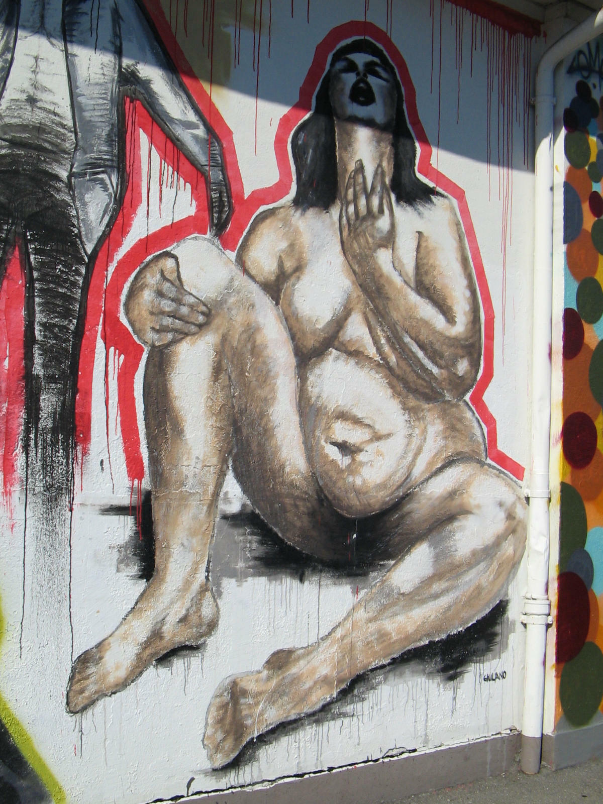 Zurich, Zollstrasse (Customs Street), graffiti with a hand, with a man, and with a naked woman in a sitting position