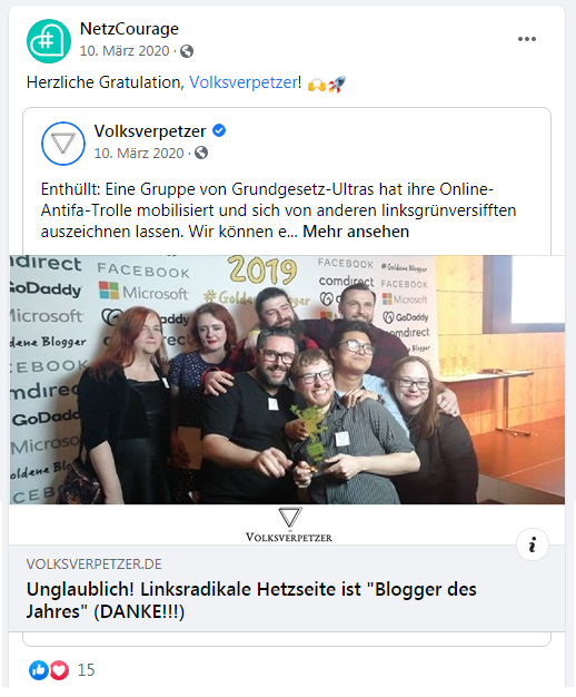 -- zum Beispiel huldigt NetzCourage der Webseite "Volksverpetzer" (Link), die einen "goldenen Preis" kriegt (Link) die gegen die Corona19-Wahrheit ankämpft, die die kriminellen Gen-Impfungen verteidigt (Link), die den Untergang der Querdenker-Bewegung feiert (Link), wo der Wahrheitssong von Xavier Nando gegen Gen-Impfungen als "Holzweg" bezeichnet wird (Link)