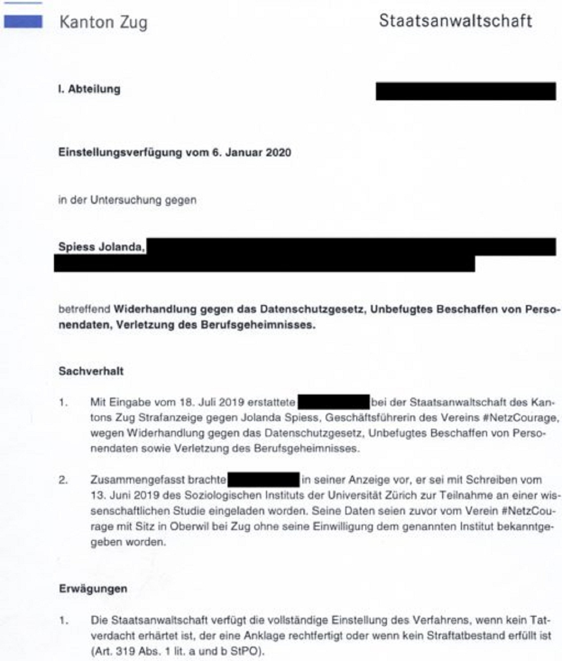 -- am 6. Januar 2020 schützt ein Gericht im Kanton Zug die Aktivistin Spiess-Hegglin,die OHNE Rückfrage und OHNE Einwilligung Adressen an die Uni Zürich weiterleitete, um eine "wissenschaftliche Studie" über die betroffenen Personen zu veranstalten (!). Mit allen Tricks und Finessen gelingt es der Justiz in Zug, das Verfahren wegen Datenschutzverletzung einzustellen [web03].
