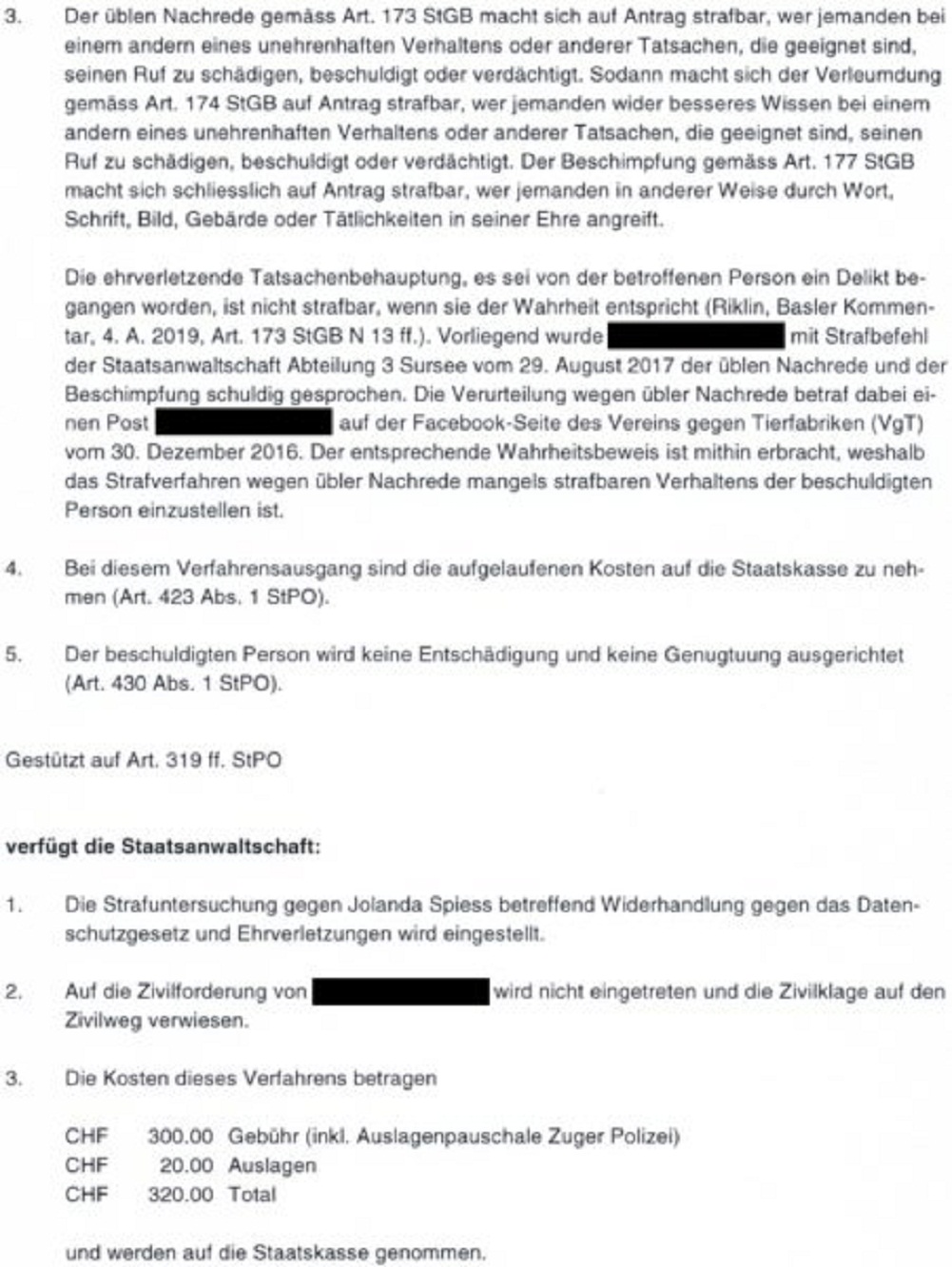Ein Strafantragsteller hatte beispielsweise vorgebracht, Spiess-Hegglin habe im Herbst 2017 (!) wahrheitswidrig behauptet, er sei per Strafbefehl wegen übler Nachrede gegen den Verein gegen Tierfabriken (VgT) verurteilt worden. Die Staatsanwaltschaft hielt fest, dass der Hass-Kommentator am 29. August 2017 tatsächlich wegen Beschimpfung und übler Nachrede auf Facebook gegen den VgT schuldig besprochen worden sei.