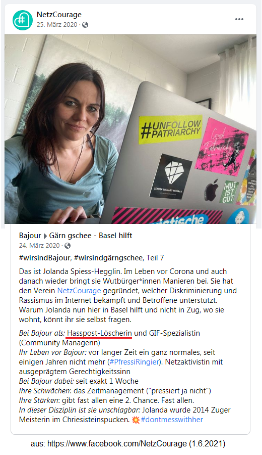 Auf der Facebook-Webseite von NetzCourage (https://www.facebook.com/NetzCourage) wird stolz berichtet, dass Frau Jolanda Spiess-Hegglin auf Facebook Einträge löscht, die als "Hass-Posts" definiert werden: