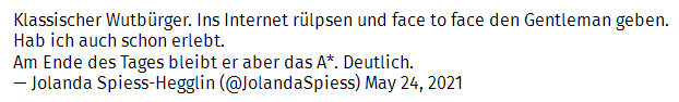 Zitat: "Woran liegt es eigentlich, dass so viele Menschen ihren Hass im Internet an Frauen auslassen? "und all die guten Männer sieht Frau Spiess-Hegglin gar nicht mehr, und all die kriminellen Frauen, die ihre Manöver gegen Männer machen, sieht Frau Spiess-Hegglin auch nicht.