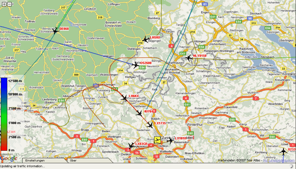 Nordanflüge auf den Flughafen Zürich-Kloten im Jahre 2007 [x001]. Man sieht Nordanflüge über Deutschland und über schweizer Gebiet mit einem U.