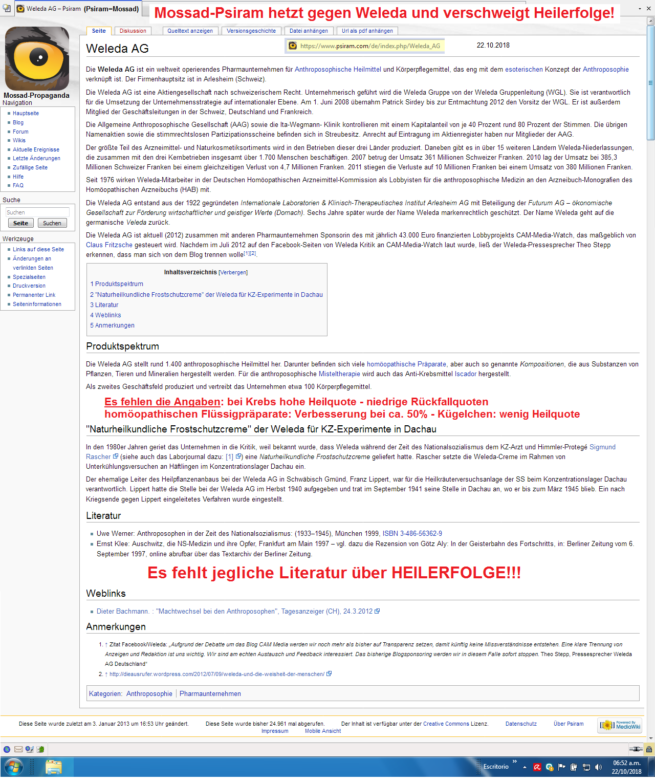 Hetzartikel von Mossad-Psiram gegen Weleda seit 4.5.2009: Alle Heilerfolge werden verschwiegen, Stand 22.10.2018