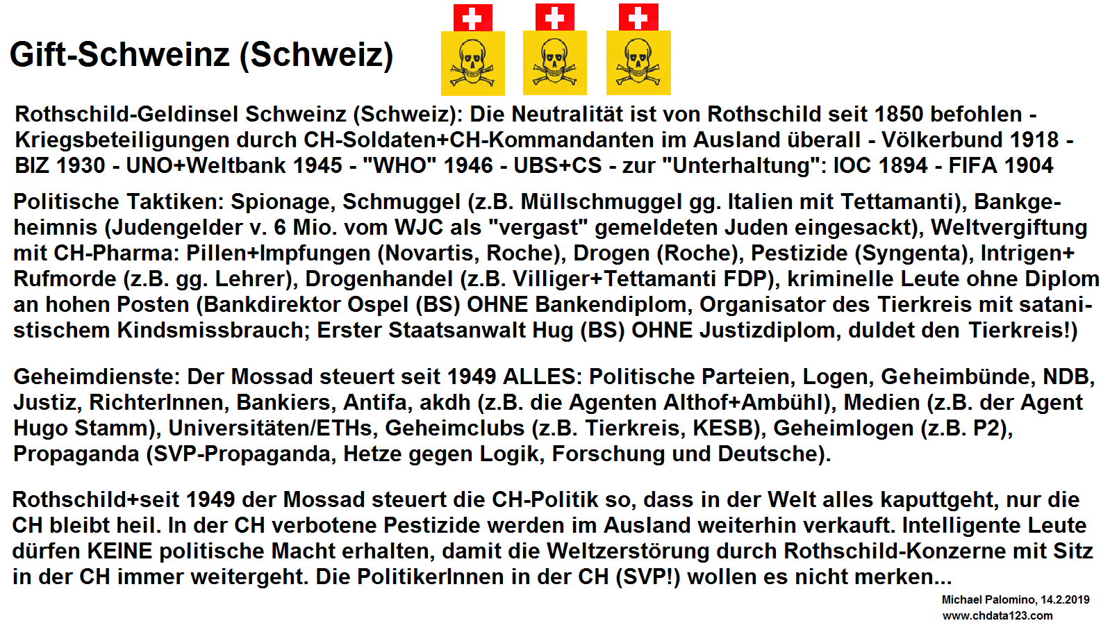 Situation seit Oktober 2023: Die Firma Schweiz: Die Schweiz wurde 2012 als Firma definiert (Unterschrift von Frau Bundesrätin Schlumpf). Und seit 2014 hat der kriminelle Billionär Bill Gates die Schweiz mit einem Abkommen gekauft. Und es wurde das GAVI in Genf installiert, das weltweite Impf-Organisationszentrum - ausserterritorial, OHNE Kontrolle. Die Regierung der Firma Schweiz ist KEINE Regierung mehr, sondern ist ein Verwaltungsrat im Sinne der tödlichen Pharma und GEGEN die gesamte Bevölkerung. Widerstand zum Überleben gibt es bei der Naturmedizin www.med-etc.com . Gegen "Corona" (Schlangengift im Trinkwasser) und gegen die "Coronaimpfung" (Spike-Proteine, Graphenoxid, zerstörtes Blut etc.) sind die Daten hier auf dem Corona-Index (Link). Die Justiz der Firma Schweiz läuft mit dem Verwaltungsrat (Bundesrat). Das heisst, die Justiz der Schweiz ist GEGEN die Bevölkerung und schubladisiert alle Klagen wegen "Corona" und "Coronaimpfung". Es geht um Aktien. Das einzige, was nun zählt, ist der Spaziergang. Da nun der Coronawahn eine Rezession provoziert, sind die Aktien aber weltweit im Sinkflug. Die kriminelle Frau Lavoyer: Ausserdem ist da eine Frau Agota Lavoyer aus Solothurn, eine Hetzerin gegen Männer mit Vorträgen auch an "Universitäten und Fachhochschulen". Diese katholische Hetzerin Lavoyer kollaboriert wahrscheinlich mit der krimnellen Mossad-Antifa von der Synagoge Leimenstrasse 24 in 4055 Basel, um an Daten gegen schweizer Männer zu kommen, dann gegen schweizer Männer zu hetzen, und um die Schweiz insgesamt zu zerstören, was auch das Ziel der Zionisten der Synagoge Leimenstrasse 24 ist - um die CH doch noch in die EU zu treiben. Lavoyer ist nun aufgeflogen,1) weil sie Sprachpolizei spielen will, OHNE Sprachen studiert zu haben (Fuck You), und weil sie Sexualdelikte ERFINDET, OHNE Soziologie studiert zu haben (sie erfindet sexuelle Gewalt). Krimineller geht es nicht. Ausserdem behauptet sie, sie würde "mit Leidenschaft" kommunizieren, mit mir kommunizierte sie aber nicht, sondern sie hat mich nach ca. 15 E-Mails über die Wahrheit im Leben angezeigt, weil sie die Wahrheit nicht erträgt, dass die Kirche die Haupttäterin in Sachen sexuelle Gewalt ist. Krimineller geht es nicht. Die Daten über Agota Lavoyer 01 - 02 - 03. Im September 2023 fliegt die kriminelle, katholische Kirche der Schweiz mit einem Bericht über 1002 Missbrauchsfälle von der Stange, 70% gegen Kinder. Die Medien schreiben oft: "Das ist wohl nur die Spitze des Eisbergs". Es wird Zeit, dass auch die Kirchenglocken endlich aufhören, die Leute schallmässig zu vergewaltigen. Die kriminelle Kirche muss GESCHLOSSEN werden. Teuerung ohne Ende - die Schweiz wird unbeliebt beim eigenen Volk. Die kriminelle Elite ist vom Schwab-WEF geschmiert und lacht die Bevölkerung aus. Man muss alternative Systeme finden. Okt.2023: Der Herzl-Zionismus von Basel geht nicht auf: Israel? Seit dem 7.10.2023 weiss die schweizer Politik nicht, was sie mit Zion-Israel anfangen soll, wo mit einer klaren Nazi-Holocaust-Taktik die Palästinenser vom Gazastreifen vertrieben werden mit Massenmord ohne Ende. Israel ist ein Nazistaat - es ist alles bewiesen, und die Synagoge Leimentrasse 24 in 4051 Basel ist das geistige Rothschild-Herzl-Zentrum davon. Es braucht ein neues Programm für den Nahen Osten, denn der Herzl-Rassismus funktioniert NICHT: 2x Völkermord gegen die Palästinenser ist einfach ZU VIEL. Das Mandat von 1919 mit Menschenrechten und den Tricks von Mutter Erde wäre besser. "Coronaimpfung" ausleiten - Daten Link - hier sind das Zeolith Link - und die Tees mit Shikimisäure Link Stand 22.11.2023 16.5.2022: Abstimmung Organspende: Hirntote sollen automatisch alle Organe spenden - wer das nicht will, kann hier das Widerspruchsformular ausfüllen Link 28.10.2025: Abstimmung E-ID: Die kriminelle E-ID wurde mit 18 zu 8 Kantonen haushoch ABgelehnt - Jansli will es nicht wahrhaben und will zusammen mit den kriminellen Firmenbossen der Schweiz die chinesische Handy-Diktatur in der Schweiz einführen - mit dem Diskriminierungs-programm "Carma" von der ETH (!) - er will mit IT+Studenten+Fussballfans die Schweiz dominieren - damit die Schweiz nie ein direkter Sklavenstaat wird wie China, bleiben Sie ein selbständiger Mensch - OHNE Handysucht - OHNE E-ID! - Details siehe: Kriminelle E-ID Index Link. 4.7.2020: Aktivisten für Grundrechte in