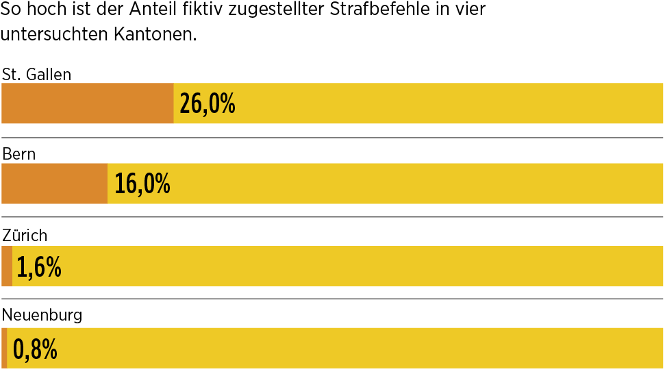 Auffällig sind zunächst die grossen Unterschiede zwischen den Kantonen. In Zürich und Neuenburg macht die fiktive Zustellung nur 1,6 respektive 0,8 Prozent der Fälle aus. In Bern liegt der Anteil bei 16 Prozent, in St. Gallen wird sogar jeder vierte Strafbefehl nur fiktiv zugestellt. Die St. Galler Praxis wurde in Basel-Stadt übernommen, mittlerweile aber vom Bundesgericht für rechtswidrig erklärt.Grosse Unterschiede zwischen den Kantonen