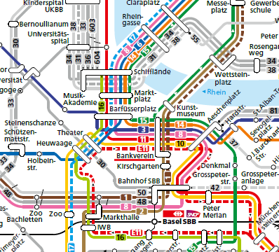 Basel Liniennetz der BVB, das Stadtzentrum mit der
