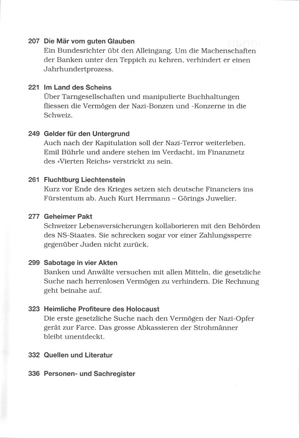 Das vorliegende Buch versucht, diesen Mangel zu beheben. Es spürt dem Handeln im Gesamtspektrum der verlorenen Vermögenswerte nach. Da werden vielfältige Formen sichtbar, die zur Verfügung standen, um die Vermögen der Nazi-Opfer verschwinden zu lassen oder um sich bei ihnen zu bereichern [die Hauptprofiteure waren Anwälte und Bankiers und Vertreter der Börsen von den Parteien SVP und FDP, die die Nummernkonten verwalteten, und die dann auch am meisten schwiegen und alle Nachforschungen unterdrückten]. Dabei zeigt sich deutlich, wie "die Schweiz" als Synonym einer Fluchtburg für Menschen und Vermögen vor dem Terror der Vernichtungsmaschinerie sich selbst mehr und mehr hineinziehen liess.