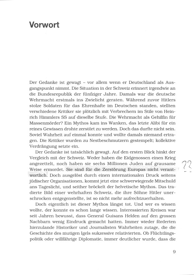 [Diese Unterdrückung der Wahrheit ist bis heute auch die Politik der rechtsextremen Partei SVP und der Mitte-Partei FDP, die beim Massenraub von Judengeldern ab 1945 die Verantwortung tragen].Der Gedanke ist tatsächlich gewagt. Auf den ersten Blick hinkt der Vergleich mit der Schweiz. Weder haben die Eidgenossen einen Krieg angezettelt, noch haben sie sechs Millionen Juden auf grausame Weise ermordet [dieser Massenmord gegen Juden ist eine grosse Lüge, und Hitchcock hat in seinen Filmen systematisch ausgemergelte DEUTSCHE und DEUTSCHE Leichen aus den Rheinwiesenlagern gezeigt]. Sie [die Eidgenossen] sind für die Zerstörung Europas nicht verantwortlich [aber schweizer Präzisionsteile ergänzten das NS-Waffenarsenal hervorragend, auch in den Raketen V1 und V2]. Doch ausgelöst durch einen internationalen Druck seitens jüdischer Organisationen, kommt jetzt eine schwerwiegende Mitschuld ans Tageslicht, und seither bröckelt der helvetische Mythos. Das tradierte Bild einer wehrhaften Schweiz, die ihre Söhne Hitler unerschrocken entgegenstellte, ist so nicht mehr aufrechtzuerhalten.
