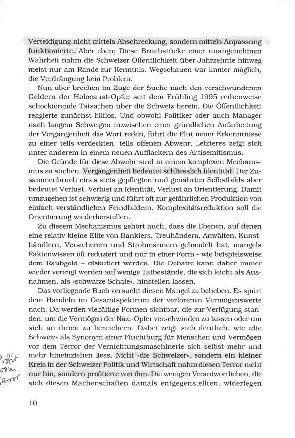 Die Bewältigung dieser Vergangenheit ist schmerzhaft. Doch am Ende des langwierigen Prozesses könnte die Schweiz reicher sein als heute, reicher als andere Länder, die diesen Prozess immer noch vor sich haben. Wird die von Bundesrat Kaspar Villiger einmal angeprangerte "Wehleidigkeit" überwunden, steht die Schweiz in ein paar Jahren nicht mehr nur für Schokolade, Kühe, Käse, Matterhorn, Perfektion und Banken. Zur neuen Identität gehören dann vielleicht ein historisches Bewusstsein und die allgemeine Erkenntnis, dass nicht nur Nazis, Mafiosi und Diktatoren Täter sind, sondern auch deren Treuhänder.