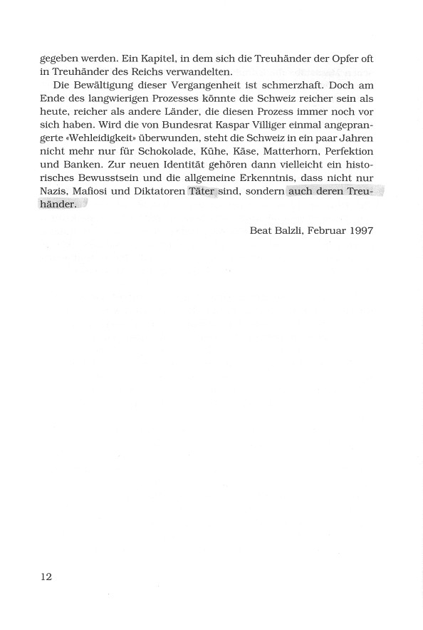 aus: Peter Balzli: Treuhänder des Reichs. Eine Spurensuche. Werd-Verlag, Zürich 1997<Vorwort