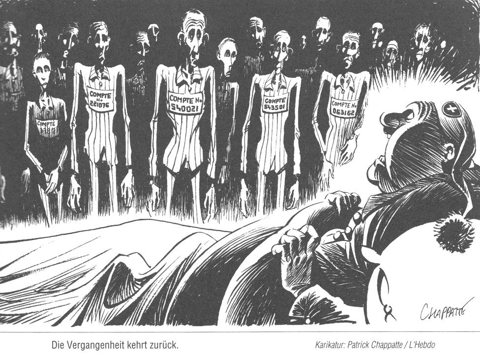 [Die Schweizer der Oberschicht, allen voran der Partei der SVP, halfen den Nazi-Grössen in Bern noch nach 1945 zur Ausreise nach Argentinien und Chile und schweizer Anwälte trugen ihnen ihr Vermögen im Diplomatenkoffer nach...].Wenn Juden und ihre Organisationen jetzt endlich Gerechtigkeit wollen, dann kann sie zwar nicht in Form von Geld wiederhergestellt werden,. Aber hierzulande scheint man gewisse Anliegen nur in Form von Geld ernst zu nehmen. Wenn humanitäre Gesten nicht aus Einsicht in die entstandene Ungerechtigkeit vollzogen werden, sondern sich nach buchhalterischen und juristischen Kriterien rechnen müssen, regiert aber das Gesetz einer eigennützigen Schadensbegrenzung. Falls dies das Credo einer ökonomisierten Gesellschaft ist, dann bekommt auch die Institution eines Fonds leicht einen fragwürdigen Anstrich.