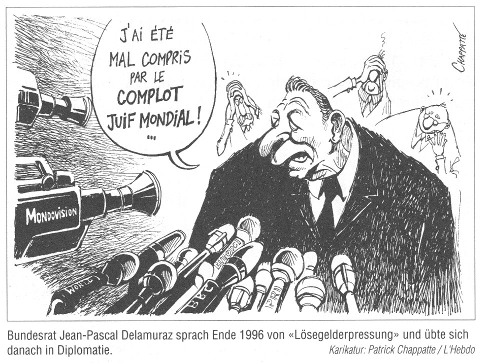 Nun aber brechen im Zuge der Suche nach den verschwundenen Geldern der Holocaust-Opfer seit dem Frühling 1995 reihenweise schockierende Tatsachen über die Schweiz herein. Die Öffentlichkeit reagierte zunächst hilflos. Und obwohl Politiker oder auch Manager nach langem Schweigen inzwischen einer gründlichen Aufarbeitung der Vergangenheit das Wort reden, führt die Flut neuer Erkenntnisse zu einer teils verdeckten, teils offenen Abwehr. Letzteres zeigt sich unter anderem in einem neuen Aufflackern des Antisemitismus [vor allem in der rechtsextremen Partei SVP, die scheinbar ab 1945 - gedeckt durch das "Bankgeheimnis" - am meisten Judengelder einkassiert hat von Juden, die "nicht mehr zurückgekommen" sind].