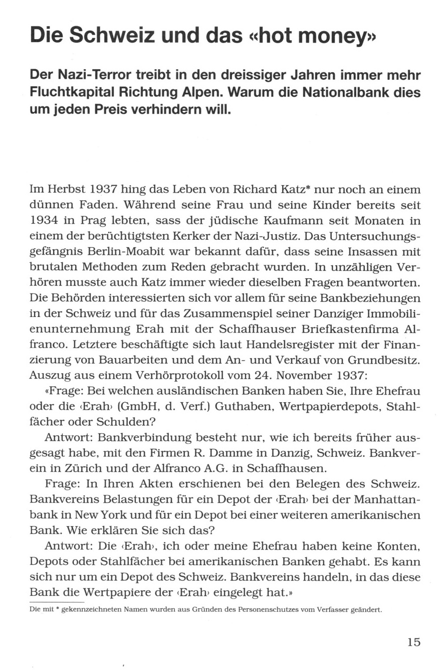 nur noch an einem dünnen Faden. Während seine Frau und seine Kinder bereits seit 1934 in Prag lebten, sass der jüdische Kaufmann seit Monaten in einem der berüchtigsten Kerker der Nazi-Justiz. Das Untersuchungsgefängnis Berlin-Moabit war bekannt dafür, dass seine Insassen mit brutalen Methoden zum Reden gebracht wurden. In unzähligen Verhören musste auch Katz immer wieder dieselben Fragen beantworten. Die Behörden interessierten sich vor allem für seine Bankbeziehungen in der Schweiz und für das Zusammenspiel seiner Danziger Immobilienunternehmung Erah mit der Schaffhauser Briefkastenfirma Alfranco. Letztere beschäftigte sich laut Handelsregister mit der Finanzierung von Bauarbeiten und dem An- und Verkauf von Grundbesitz. Auszug aus einem Verhörprotokoll vom 24. November 1937: