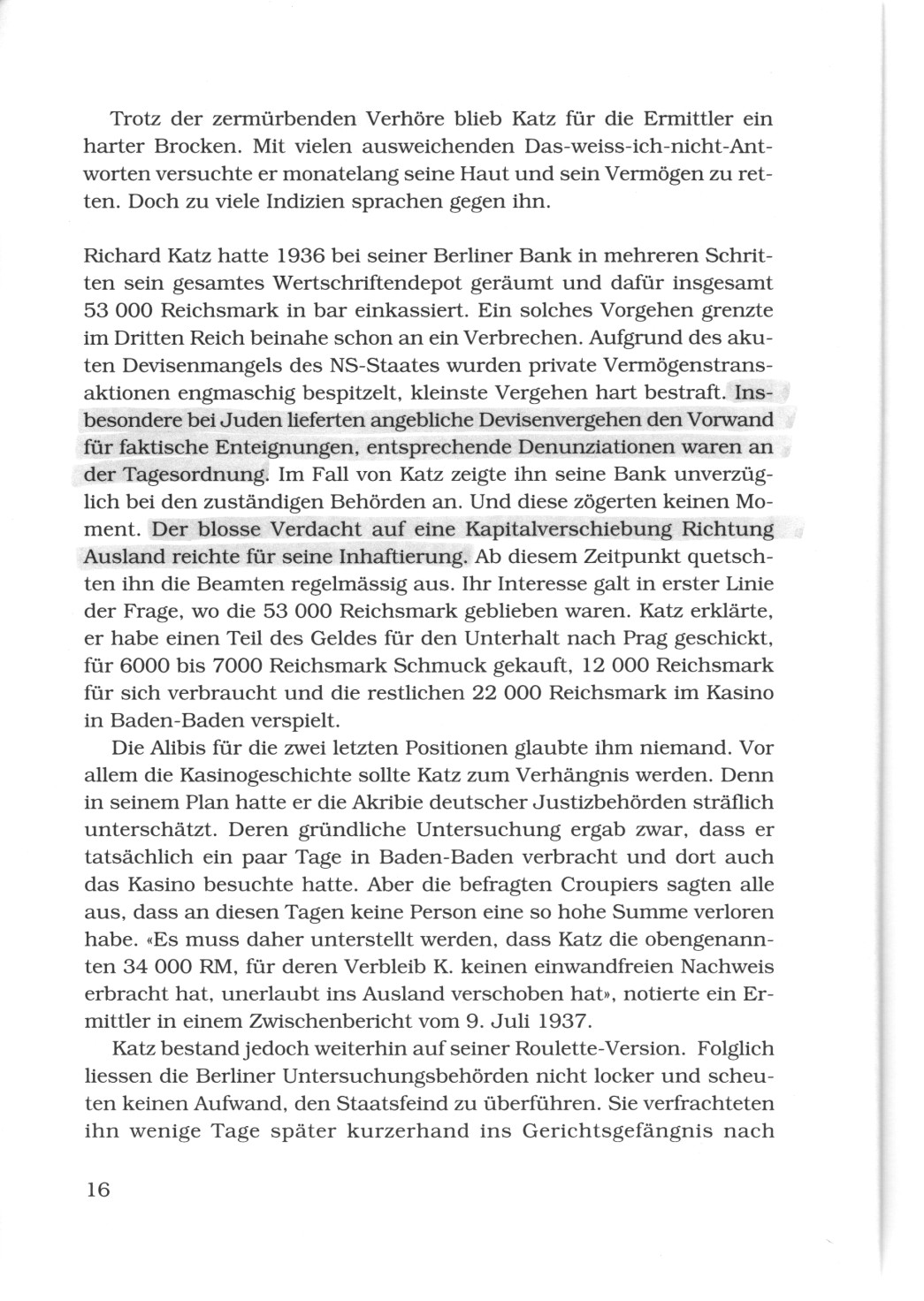 Katz bestand jedoch weiterhin auf seiner Roulette-Version. Folglich liessen die Berliner Untersuchungsbehörden nicht locker und scheuten keinen Aufwand, den Staatsfeind zu überführen. Sie verfrachteten ihn wenige Tage später kurzerhand ins Gerichtsgefängnis nach (S.16)
